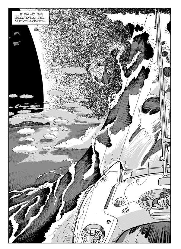 Da ricordare le tavole da pagina 116 a pagina 128 che raccontano il rocambolesco attraversamento in barca del muro d’acqua, ritenuto insormontabile, che divide il mare del pianeta nelle due parti che non si conoscono: l’isola di Jim e Rose e la città misteriosa da cui proviene Ezra. La velocità, il dinamismo e il pericolo sono resi da vignette tagliate obliquamente con una pendenza che ricalca quella del mare al di qua e al di là del muro. Spettacolari le due tavole con vignetta a pagina intera corrispondenti alla parte centrale dell’azione: a sinistra l’imbarcazione in vertiginosa salita ormai prossima alla cresta dell’onda, e a destra la stessa in ripida discesa sul fronte opposto.