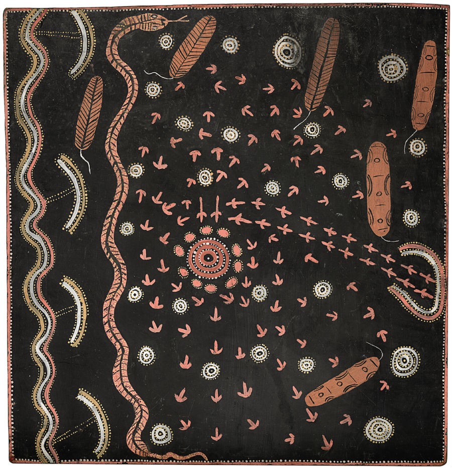 L’origine è il concetto cardine della mostra, a cominciare dal titolo stesso: “Aux sources de la peinture aborigène”. Connotata da una valenza sacrale ed esoterica, l’evocazione dell’origine disinibisce l’interpretazione individuale del singolo artista, caratteristica che predomina invece nell’arte contemporanea. L’originalità artistica (inizialmente intesa come prossimità con l’origine) ritrova allora nell’arte aborigena un senso arcaico e più vicino a quello di estasi religiosa che di stile individuale. Se nell’arte occidentale è l’interpretazione del singolo artista che viene messa in mostra e acquista valore perfezionandosi in uno stile individuale, nell’arte aborigena non si è arrivati a questa traduzione, forse per una conoscenza ancora troppo grezza della materia. Malgrado la presentazione dei diversi artisti che lavorano alla trasmissione del Dreaming, la potenza di questi dipinti è quindi essenzialmente evocativa, e resta legata all’idea che ogni rappresentazione sia meno frutto di una interpretazione personale, quanto più la carta d’identità di un luogo sacro, il ricordo di canti e cerimonie antiche. I segni ancestrali costituiscono un tentativo di riattivare un legame intertemporale tra gli Antichi e il mondo terreno, e l’ermeticità di questi quadri, molto dei quali non ancora spiegati e tradotti dagli esperti, ne accresce il fascino.