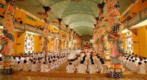 E in effetti, il tempio traspone nella sua poli-cromaticità il sincretismo di cui è portatore, in una comunione di colori e diramazioni della fede. A dominare sono le tonalità primarie: l’azzurro luminoso del marmo, il giallo dell’intonaco e il rosso degli spioventi, la cui forma richiama quella delle pagode. Come tutti i templi caodisti, anche quello di My Tho presenta una pianta rettangolare bassa e allungata, mentre l’entrata è indicata da due torrette simmetriche terrazzate su più livelli. All’interno, lo spazio è suddiviso in navate i cui colonnati sono “infestati” da dragoni multicolori. Sul fondo, invece, è eretto l’altare principale, riconoscibile per l’immagine dell’occhio – simbolo del Caodismo – che svetta tra due ibis e un fitto aroma speziato.
