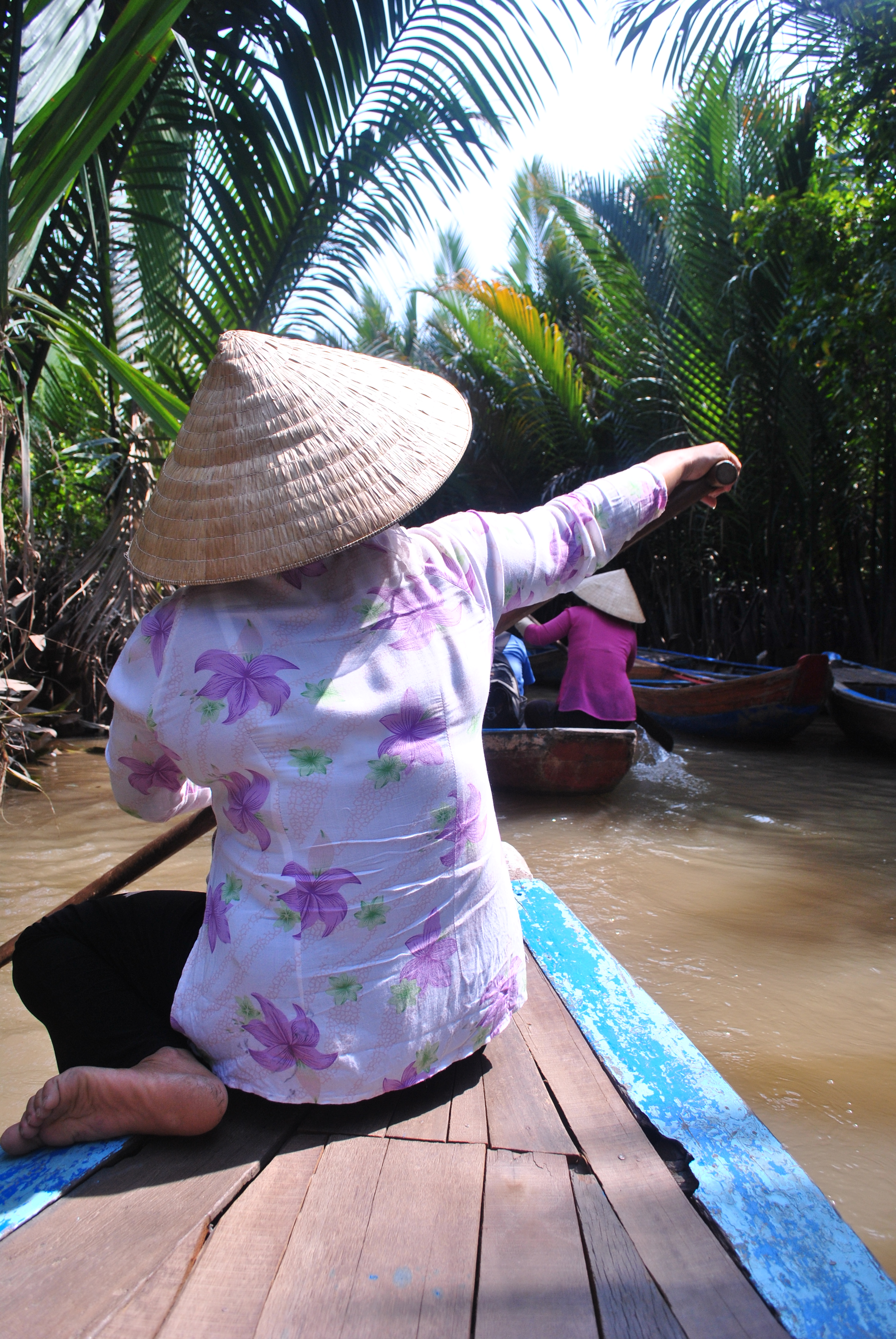 A bordo di una canoa che, placida, scorre sul Mekong sollevata appena di una decina di centimetri dall’acqua, ci inoltriamo precari, eppur sicuri, all’interno di stretti canali abbracciati da fitte mangrovie. L’imbarcazione è condotta da una giovane-dal-nome-ignoto la quale, seduta sul vertice estremo della prua, ricurva e con le gambe accovacciate di lato, affonda un unico lungo remo nella fanghiglia del canale. L’acqua è d’un marrone torbido-immobile e quando mi sporgo dalla canoa la mia immagine mi viene restituita con la nitidezza degna di uno specchio. A quel punto sento di dover dare un contributo e impugno il remo che mi sta accanto, iniziando a rilanciare l’andatura della canoa con alcune pagaiate, prima a destra e poi a sinistra. “Good job!” mi dice Cham con fare di scherno. Ma l’afa è troppo opprimente perché il mio sforzo, già di per sé indolente, abbia un seguito. Eppure la giovane-dal-nome-ignoto pare menare la canoa con una disinvoltura scevra di fatica. Stoicismo o allenamento, davvero non saprei dire.