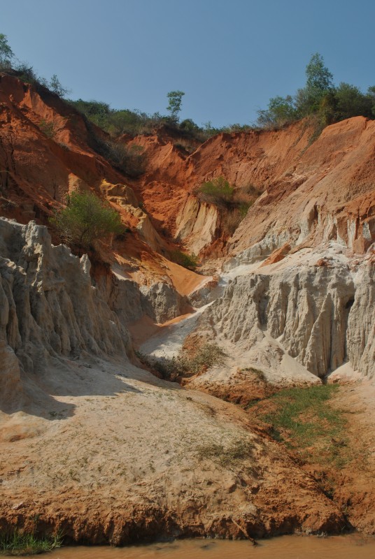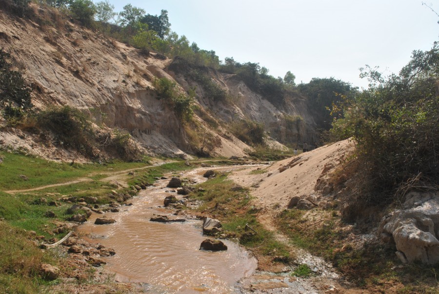 Quando siamo al limitare del villaggio, svoltiamo a sinistra e dopo un breve tratto sterrato ci fermiamo. “Now we go on foot”, dice Sun. “It takes an hour to walk the stream and back. I wait there, under the tree…I paint something”. Lasciato Sun alla sua arte, mi avvio da solo. La sorgente delle fate è un placido corso d’acqua profondo appena una decina di centimetri che dal mare si insinua delicato tra le rocce rosso-pastoso dell’entroterra di Mui Ne. Il mio intento è quello di raggiungere le delicate cascate che si trovano a circa mezz’ora di cammino e poi tornare indietro per recarmi alle dune by car sulla scia delle sfumature del tramonto. Solcando a piedi nudi il fondale del corso – un pasticcio tiepido di sabbia e simil-creta – ci si addentra in una vegetazione che dimentica ben presto i colori arsi della costa e si fa verdeggiante e rossa allo stesso tempo. Verde tropicale e rosso marziano. I toni si accostano, si alternano, ma rimangono pur sempre distinti lungo il percorso, sicché paiono macchiare il fondale turchese del cielo in maniera disomogenea, a chiazze, in una sorta di trasfigurazione fauvista di un canyon a reminiscenza americana. Ragazzini di appena 7-8 anni mi tarantolano intorno a sciame d’ape, tutti insieme, sguazzando nelle acque tiepide del corso e offrendosi, a turno, di farmi da guida. In cambio, ovviamente, di qualche dollaro. Ma la semplicità del cammino non richiede, in effetti, altro che il silenzio della contemplazione. E nemmeno la presenza di alcuni visitatori – pochi, per la verità, forse a causa dell’orario improbo – sembra capace di deflettere l’equilibrata atmosfera del luogo, come se un sacro rispetto si imponesse sulle impronte fangose di ognuno di noi. Just quietness.