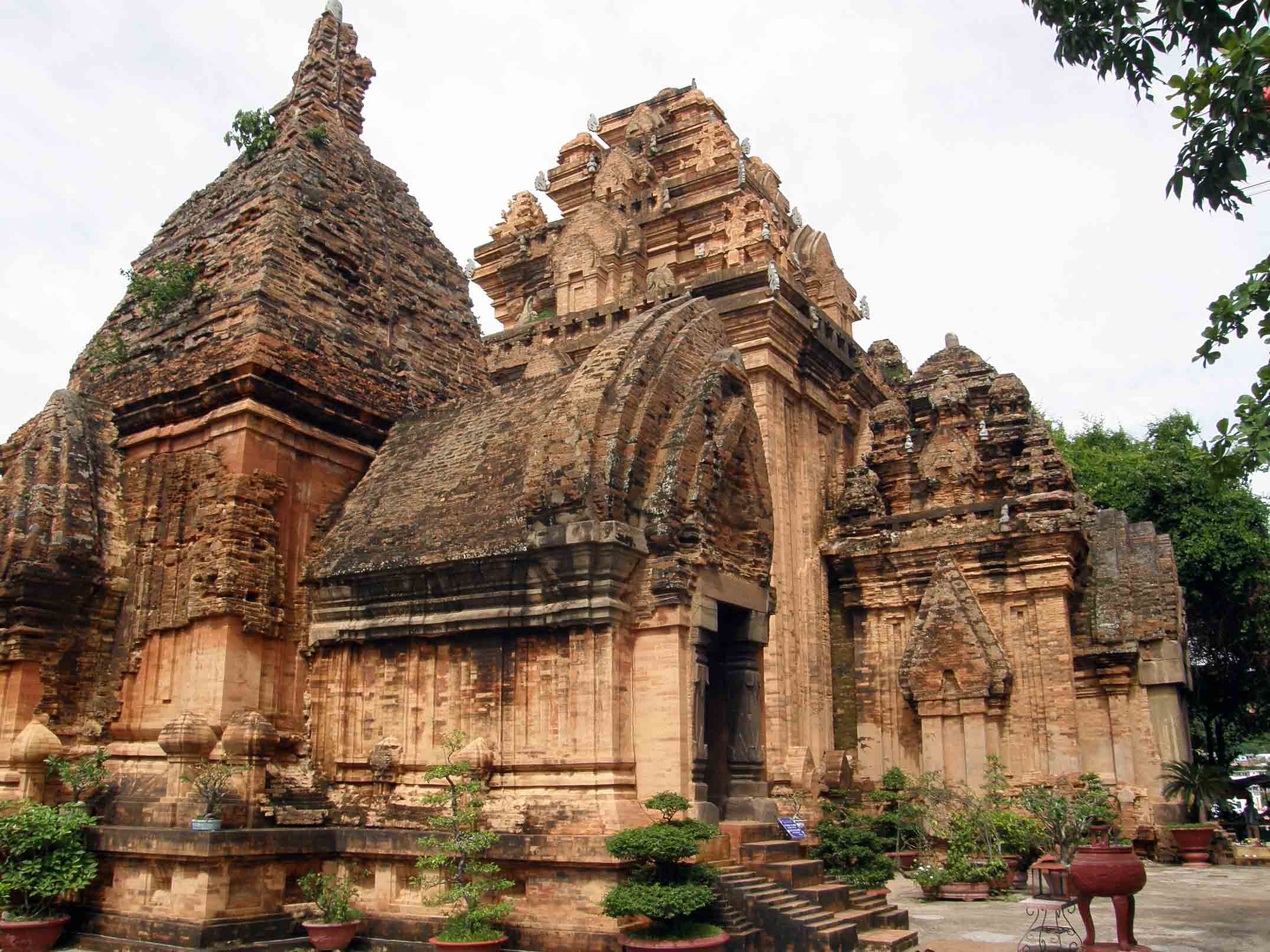 Le quattro torri Cham di Po Nagar (inizialmente erano otto), ci sono ora dinnanzi. In ragione della loro forma “a tumulo” assomigliano a tarchiati alveari vagamente reminiscenti i trulli di Alberobello (sebbene queste torri siano di un rosso purpureo). Leggo dalla guida che furono costruite in diverse fasi tra il VII e XII secolo in onore della dea Yang Po Nagar. Ma già dal II secolo questa zona era dedicata al culto. Tuong, da parte sua, pare sminuire la genealogia millenaria delle rovine, sostenendo che risalgono al XVII secolo. Ci sarebbe materiale – ma non certo il tempo, né lo spazio – per un trattato sull’interpretabilità dei secoli e la relatività del divino. Sicché, ciò che importa, qui e ora, è che queste torri ci offrano almeno riparo dal nubifragio.