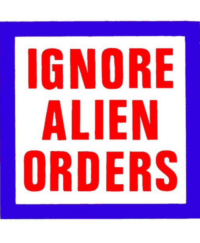 Quando mi svegliai il giorno dopo quel messaggio era ancora così assurdo che mi restò in mente. “Ignorare gli ordini alieni”, bella idea. Andai a trovare il mio amico artista Michael e insieme decidemmo di farne un logo, stampando la serigrafia in diversi colori: rosso e blu su fondo giallo, bianco, e argentato.