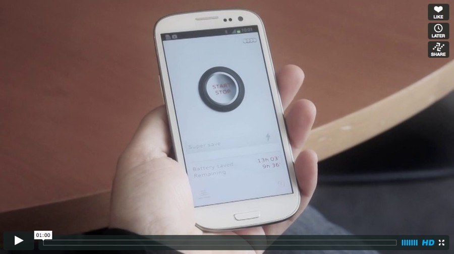 Se le applicazioni Kellogg’s sono di pertinenza evidente, spesso le strategie possono essere più sottili e permettere di sganciarsi dal contesto marketing, arrivando là dove non ce lo si aspetterebbe e dove le “difese” contro il discorso commerciale sono quindi più basse. Questo è ad esempio il caso di Audi Spagna, che ha creato un’applicazione per mettere in stand-by il telefono quando non viene utilizzato, proprio come le macchine che si spengono al semaforo. L’isotopia semantica è attivata dalla forma dello start, che riprende quella del pulsante sulla Audi.
