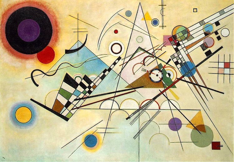 Nel corso della sua carriera di artista, Kandinskij ha sempre tenuto in alta considerazione la musica come modello estetico. Fin dallo scritto Linguaggio dei colori (1910), Kandinskij tenta di definire una sorta di “trattato di armonia” analizzando le risonanze psicologiche del colore con il mondo sonoro [1]. Del colore arancione, per esempio, scrive che “ha il suono di una campana mediana che chiami all’angelus, o come un robusto contralto, come una viola che canti un largo”. A proposito del viola, “un rosso reso più freddo, tanto fisicamente quanto psichicamente”, il pittore osserva che “è simile al suono del corno inglese, della zampogna e, in profondità, somiglia ai suoni profondi degli strumenti di legno (per esempio del fagotto)”. Ma è sul bianco che Kandinskij si sofferma più a lungo, su questo “simbolo di un mondo nel quale tutti i colori, in quanto qualità e sostanze materiali, sono spariti. Questo mondo sta così alto sopra di noi che non ci riesce di udire alcun suono che ne provenga. Ne proviene anzi un grande silenzio che rappresentato materialmente ci appare come un muro freddo, invalicabile, indistruttibile, che si prolunghi all’infinito. Per questo il bianco agisce sulla nostra psiche come un grande silenzio, che per noi è assoluto. Interiormente risuona come un non suono, abbastanza simile a certe pause della musica, a quelle pause che interrompono solo temporaneamente lo svolgimento di una frase o di un contenuto e non sono la definitiva conclusione di uno svolgimento. E’ un silenzio che non è morto, ma pieno di possibilità”. D’altra parte, anche l’accostamento antitetico tra il bianco e il nero suggerisce al pittore un’analogia con il suono: “[Il nero] esteriormente è il colore che ha minore sonorità e sul quale perciò ogni altro colore, il meno sonoro, risuona con maggior forza e precisione. Non così il bianco, sul quale quasi tutti i colori hanno smorzata la loro sonorità, e sul quale alcuni perfino si sciolgono, lasciando un’eco debole e affievolita” [2]. Quelle che possono sembrare delle metafore che svolgono un semplice ruolo retorico sono, in realtà, il punto di partenza di un lungo cammino verso la musica intesa come sintesi delle arti.