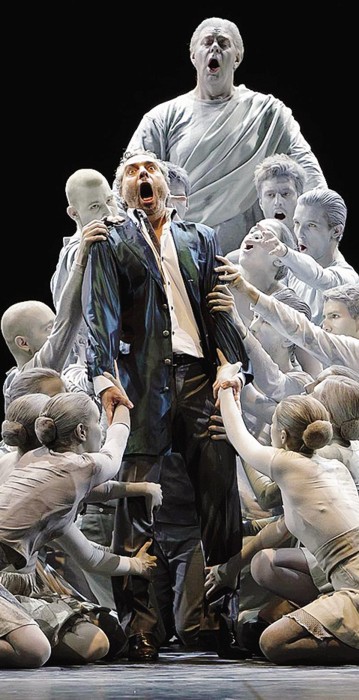 La straordinaria trama che pare un rondò di immagini prende piega tra le mani del noto ed acclamato regista inglese Graham Vick – e del responsabile di scene e costumi Stuart Nunn – che decide di darne una lettura in chiave moderna (e nichilista), scadendo però nel volgare: mosse dozzinali che lasciano poco all’immaginazione, un Leporello in tuta Adidas blu e verde fosforescente, Don Giovanni che intonando “Fin c’han dal vino” prepara il braccio per iniettarsi una dose di eroina, la festa del secondo atto in cui tutti attendono con ansia il piatto portato dal protagonista contenente quantità industriali di cocaina e molto altro ancora che ha diviso in due il pubblico presente, e che sarebbe decisamente il caso di dimenticare. Tra cassettoni dell’immondizia con manichini femminili, che sottolineano il carattere usa – e – getta della donna e la scritta “PADRE” e “PAPÀ” sembra essere racchiuso il messaggio del regista (che nelle scene collettive di festa sembra richiamare l’atmosfera de La Grande Bellezza sui terrazzi, con donne in miniabiti, tacchi vertiginosi e strass in abbondanza) del contrasto inevitabile tra il vecchio e il nuovo e il conseguente – qualcuno potrebbe dire – crollo dei valori.