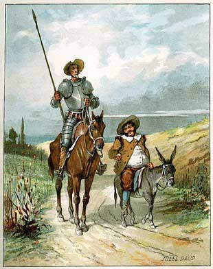 Così si spiega, ad esempio, come il singolare contrasto fra l’elegante figura di Don Chisciotte e quella rozza del suo scudiero non possa essere soltanto una trovata umoristica fine a se stessa, ma serva a simboleggiare il più importante contrasto fra idealità e venalità, spirito e carne.