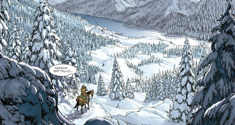 GD: Non ho ancora avuto il piacere di conoscerlo. La sua sceneggiatura è scritta davvero bene, ho adorato il modo gusto per le battute secche che lasciano intendere la psicologia dei personaggi dal non detto, non è una cosa immediata da cogliere, ma è propria della sceneggiatura cinematografica prima che fumettistica, ed è una cosa che apprezzo molto. Credo che l’aspetto dell’accelerazione finale sia il risultato di una scelta precisa, che in un certo senso difendo. Sicuramente 4-8 pagine in più avrebbero certamente permesso di costruire un finale più denso, ma evidentemente così non era possibile e Gianfranco probabilmente ha preferito costruire le atmosfere e lasciare i giusti silenzi e gli spazi per i grandi panorami e suscitare le emozioni che sono arrivate piuttosto che “sprecare” pagine preziose e lasciando un albo che benché non perfetto si lasci comunque ricordare… Ma le mie sono solo supposizioni, quando lo conoscerò, glielo chiederò :-)…