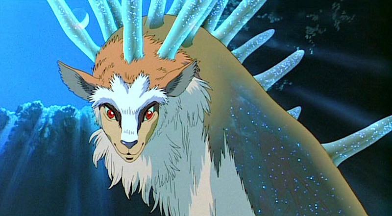 Rispetto al viandante notturno, Amaterasu era una dea latrice di vita, collegata alla luna. Nella mitologia nipponica, Tsukuyomi, suo fratello, è appunto il dio della luna resosi responsabile della morte della dea del cibo, Uke Mochi, che aveva fatto apparire una serie di pietanze in modo da lui ritenuto disgustoso. Lo spirito del bosco, in compenso, alla luce del giorno assume le sembianze di un Grande Cervo, animale che ricopre uno speciale significato nell’ambito della cultura giapponese in quanto già nel 1637 iniziò a essere considerato divino. Se ci riallacciamo alla cultura indoeuropea, notiamo che entrambi i concetti confluiscono in divinità quali Cernunnos, dio cervo fecondatore della terra, e da questo si evince che Miyazaki sembra creare interessanti connessioni riguardo al significato mistico del cervide. Un simile cliché non è estraneo agli artisti che si sono succeduti nel corso della storia, anche se il Cervo astato di Kim Myeongbeom, opera contemporanea dall’evidente significato ecologista che sembra ricordare lo spirito del bosco della Principessa Mononoke, è particolarmente suggestivo. La decapitazione, da parte di Lady Eboshi, di questo guardiano primordiale, rappresenta il pericolo che corre l’umanità nel trascurare la Terra, poiché è proprio il pianeta a fornirci il sostentamento e a darci la vita.