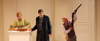 Duchotel (è vestito come nell’atto primo, tranne che per i pantaloni che sono quelli indossati da Moricet nell’atto secondo, e porta il fucile nella sua custodia ad armacollo. Regge un enorme paniere che cerca di mettere in bella mostra tenendolo a braccia tese e all’altezza della testa) Signora!… Dov’è la signora?