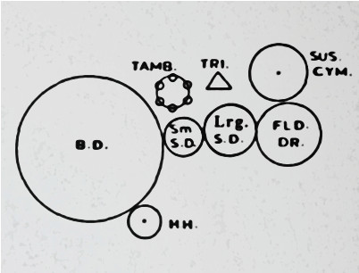 I suoni previsti sulla grancassa sono due, per questo motivo sarà suonata al bordo e al centro, inoltre sarà adoperato il battente con la testa di cuoio nelle due marce e il battente con testa morbida negli altri brani. Nelle due marce, il piatto sospeso sarà suonato con il corpo della bacchetta sul bordo, per emulare insieme all’hi-hat il suono caratteristico dei piatti a due suonati marciando in una banda musicale. Nel tango, invece, il suono previsto deve essere ampio, e quindi il piatto sarà suonato alla metà. I due tamburi rullanti di diversa dimensione saranno suonati senza cordiera inserita, mentre il tamburo militare suonerà con la cordiera inserita in Marche royale battuta quattordici, in Couplet du Diable. In tutti gli altri brani, e dove previsto, il tamburo militare dovrà essere suonato senza cordiera.