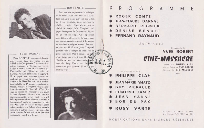 Rappresentato per la prima volta cinque anni dopo la pubblicazione degli Esercizi di stile (1947) di Raymond Queneau, Cinemassacro (1952), di Boris Vian, è anch’esso, nel suo piccolo, un esercizio di stile. Partendo dal presupposto, neanche tanto errato, che le trame cinematografiche dell’epoca si assomigliassero un po’ tutte focalizzandosi su tre elementi classici quali un uomo, una donna e una storia d’amore, Boris Vian, su suggerimento di Pierre Kast e Jean-Pierre Vivet, decise di trasferire il cinema sul palcoscenico attraverso una serie di sketch in grado di parodiare i generi più celebri della settima arte. Fu così che, la notte dell’8 aprile 1952, il palcoscenico del cabaret La Rose Rouge di Parigi ospitò la prima rappresentazione di uno spettacolo destinato a superare le quattrocento repliche e ad essere ripreso, due anni dopo, dalla compagnia del teatro Les Trois Baudets per restare in scena altri nove mesi. Questo fa di Cinemassacro uno dei testi brevi di maggior successo di Boris Vian benché le informazioni disponibili sulla sua realizzazione siano veramente poche.