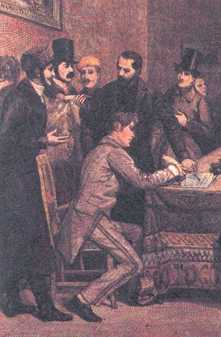 […] Mi posi al cembalo, coi versi di Goffredo sul leggio, e strimpellavo, assassinavo colle dita convulse quel povero strumento, sempre cogli occhi all’inno, mettendo giù frasi melodiche, l’una sull’altra, ma lungi le mille miglia dall’idea che potessero adattarsi a quelle parole. Mi alzai, scontento di me; mi trattenni ancora un po’ di tempo in casa Valerio, ma sempre con quei versi davanti agli occhi della mente. Vidi che non c’era rimedio; presi congedo, e corsi a casa. Là, senza pure levarmi il cappello, mi buttai al pianoforte. Mi tornò alla memoria il motivo strimpellato in casa Valerio: lo scrissi su d’un foglio di carta, il primo che mi venne alle mani: nella mia agitazione rovesciai la lucerna sul cembalo, e per conseguenza anche sul povero foglio: fu questo l’originale dell’inno “Fratelli d’Italia”. […]