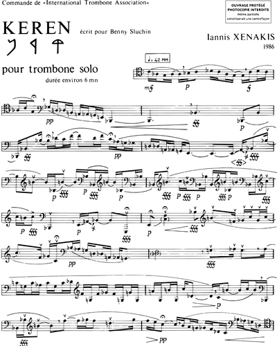 Ulteriori apici ritroviamo in Keren (1986) per trombone solo, Nomos Alpha (1965) e Kottos (1977) per violoncello. E ancora potrà essere ricordato l’uso innovativo delle voci in brani come Nuits (1978-79) e la predilezione per le percussioni come ad esempio in Psappha (1975) o nel precedente Persephassa (1969) dove si dà spazio a suoni-richiamo, quasi avvertimenti seducenti.