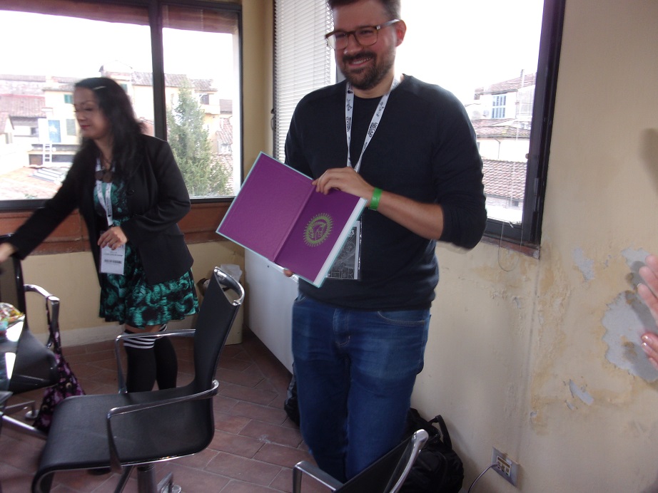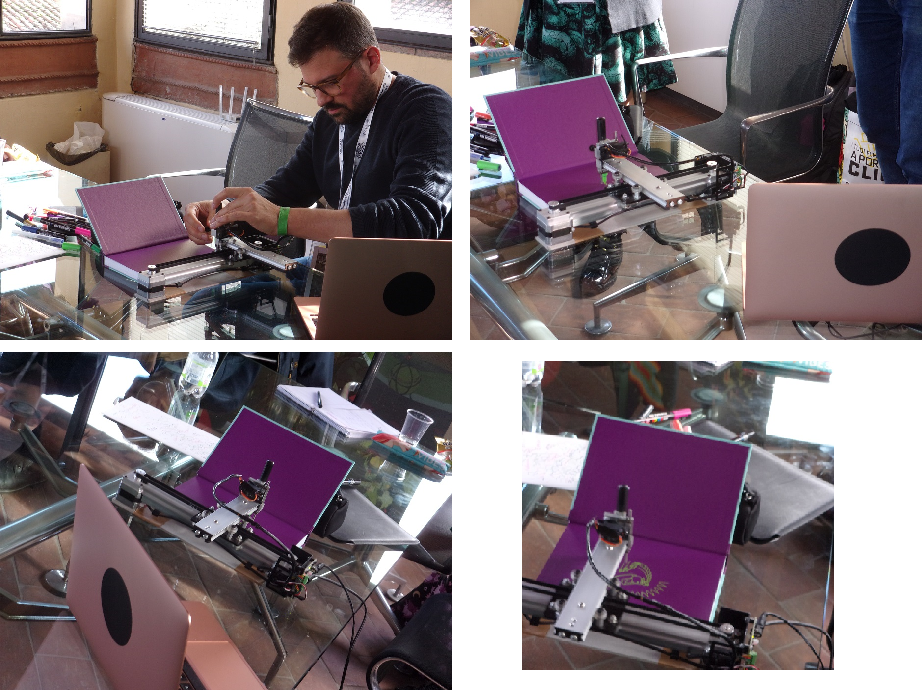 L’incontro si conclude con una séance de dédicace originale: invece di fare il classico disegnino con cui i fumettisti francesi decorano l’albo appena venduto, Panchaud tira fuori dal suo cappello a cilindro uno strumento di sua invenzione: una specie di plotter (o è più giusto chiamarlo pantografo?) a cui invia da un computer portatile l’impulso dell’immagine che andrà a decorare il volume. Sceglie il pennarello giusto da applicare alla macchina, imposta l’operazione e les jeux sont faits. Ovviamente chi conosce la BéDé non è nuovo a performance bizzarre, tra autori che strappano o bruciano o passano con la moto sopra i loro albi, ma la quasi totale esclusione dell’elemento umano trasmette una sensazione un po’ inquietante. È vero che Pedro Oyarbide nella sua conferenza si esibirà in una “dédicace” che consiste semplicemente nell’apporre un timbro che ha costruito lui stesso sul frontespizio di un libro, ma in quel caso ha dovuto comunque esercitare in prima persona la pressione per far attecchire l’inchiostro, non ha delegato tutto il lavoro a una macchina.