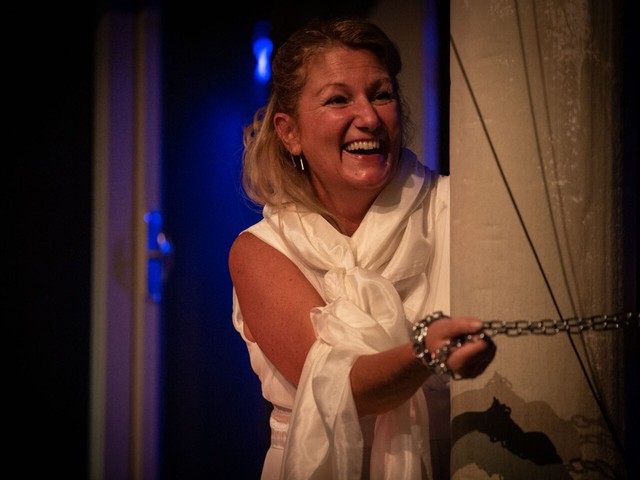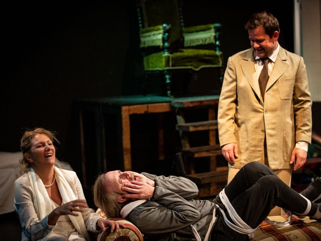 L’allestimento nel ridotto del teatro è azzeccato. Questa scelta permette una maggiore vicinanza con il pubblico e interazione con lo stesso, anche perché lo spettacolo è molto fisico. Non vediamo un padre morente steso a letto che si lamenta, ma un uomo in continuo movimento, un personaggio che manifesta con il suo corpo i suoi tormenti, e il figlio, la nuora e il signore del castello non sono da meno nell’esprimere fisicamente i sentimenti che li pervadono, con il loro prendere possesso della scenografia, degli oggetti di scena, sedersi a cavalcioni sulla parete di fondo, legarsi alle colonne, uscire da un lato per poi spuntare dall’altro, guardare negli occhi il pubblico come alla ricerca di un complice.